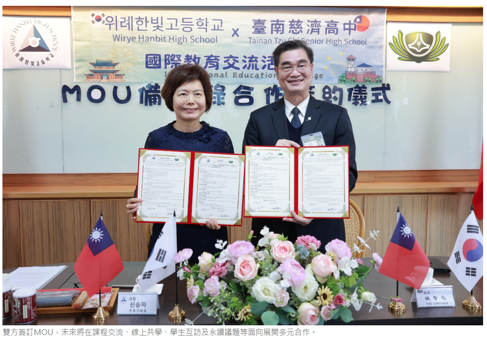 臺南慈濟高中國際教育持續向前,於2026年1月15日正式與韓國京畿道城南市慰禮HANBI高校簽署合作備忘錄(MOU),合作期程自2026年起至2028年12月31日。