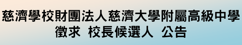 - 依據「慈濟學校財團法人校長選聘及解聘辦法」公開徵求校長候選人,歡迎各界人士推薦或自我推薦。