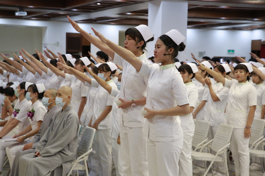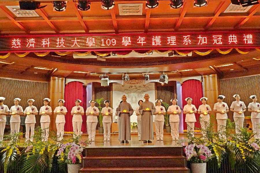 有別於以往五月護師節加冠的傳統,今天因2020新冠肺炎疫情被迫順延的慈濟科技大學第29屆加冠典禮,更顯得意義非凡。因為,405位護理系三年級學生(四技152人、五專253人)已陸續踏入臨床實習的第一線,體會到守護生命的價值,堅定的齊聲宣誓「發揮護理專業的服務熱誠,宏揚人傷我痛的慈濟精神」!護理系三年級學生穿著純白的護士服,依序上台讓老師親自替孩子戴上護士帽,見證踏入護理生涯的里程碑。再點亮盞盞心燈,傳承視病如親的護理精神。慈科大校長羅文瑞表示,加冠就是護生的成年禮,代表大家終於能接觸臨床實習。只是,上課地點已不在教室,面對的也是真實的病患,難免有沮喪挫折,所以,更要學習調適壓力和時間管理。護理系主任張紀萍表示,加冠典禮是非常有意義的時刻,期待大家都能勇於承擔,展現視病猶親的態度。靜思精舍德禪法師表示,由於新冠肺炎疫情重創全球,延誤五月加冠傳統,導致不少學生提前踏入臨床實習,面對病患時,千萬別忘記「細心、愛心、耐心、悲心、用心」。