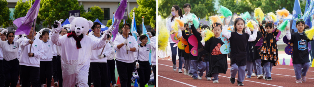 開幕典禮是師生創意進場,生命教育和環境教育是慈濟人文的核心價值,同學們身著動物造型服裝,化身為環保小天使,呼籲大家一起「茹素做環保,地球會更好」。