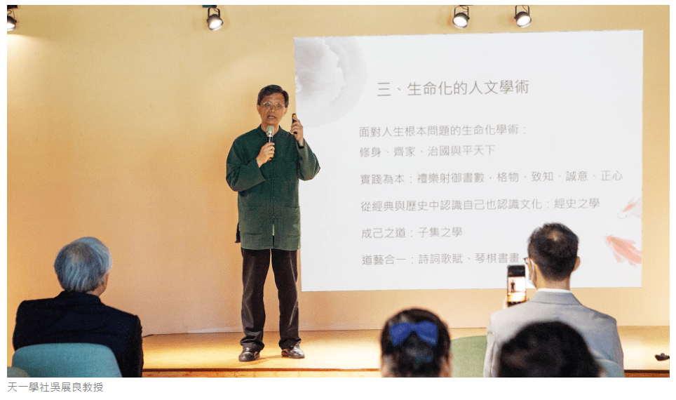 簽約後,吳展良教授也以“生命化的人文學術與教育”為題進行分享,吳教授表示,人類幸福的關鍵在於其生命內涵的提升。現代社會因為太過物化,造成人與人及大地關係越來越疏離,而西方科、哲學難以處理人生、倫理與文化的根本問題,因此需要推展新世紀經典人文教育,也就是全人、全生命的教育。透過經典可以讓孩子認識自己的歷史和文化,經典的內涵更可以提供現代人所需的人文教育,改善現代生活與文化。