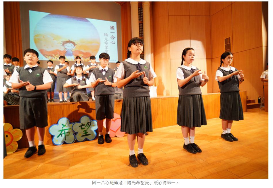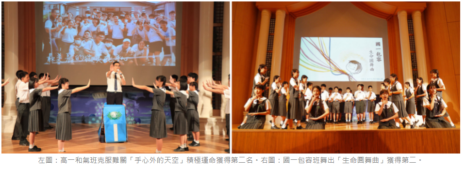 高中部以「逆風飛翔」榮獲第一名,在班上負責排練的高一包容班傅可言同學分享「我們班整體的氣氛很和諧,這學期過後要分班,珍惜彼此是我們最大的動力。」一同負責的陳佩均同學表示贊同並提到:「主導的同學講呈現的概念,班上就會有人主動給建議。」兩位同學都強調在比賽中是以平常心展現真實的一面,在尾聲加入同學被欺負的的橋段,邀約平時與班上感情良好的莊詠丞老師與于珮婷老師呼應歌詞「親愛的你別在意,別管一路風和雨,做自己,笑看那些不如意,不怕風雨,你看人生多麼的美麗。」傳遞如陽光般溫暖的愛。除了師長的關懷,高一包容班協力將手語學習有狀況的同學特別訓練,借用禮儀教室的鏡牆凸顯差異,以求手語動作一致,在比賽前夕持續精進,完整呈現歌曲的精隨「逆風的方向,更適合飛翔;我不怕千萬人阻擋,只怕自己投降。」