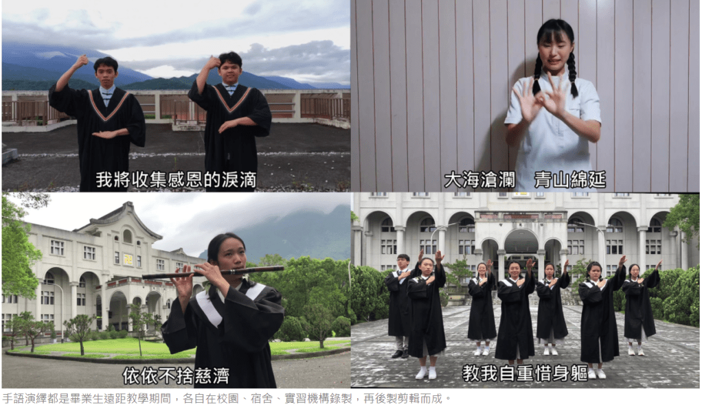 「一場線上播出的畢業典禮,成就了一群最特別的畢業生。」特別的是,手語演繹都是畢業生遠距教學期間,各自在校園、宿舍、實習機構錄製,再後製剪輯而成,還首度加入了竹笛演奏,感覺別有一番滋味。正如人文室主任謝麗華叮嚀的「善用有限的資源,做能做的事。」