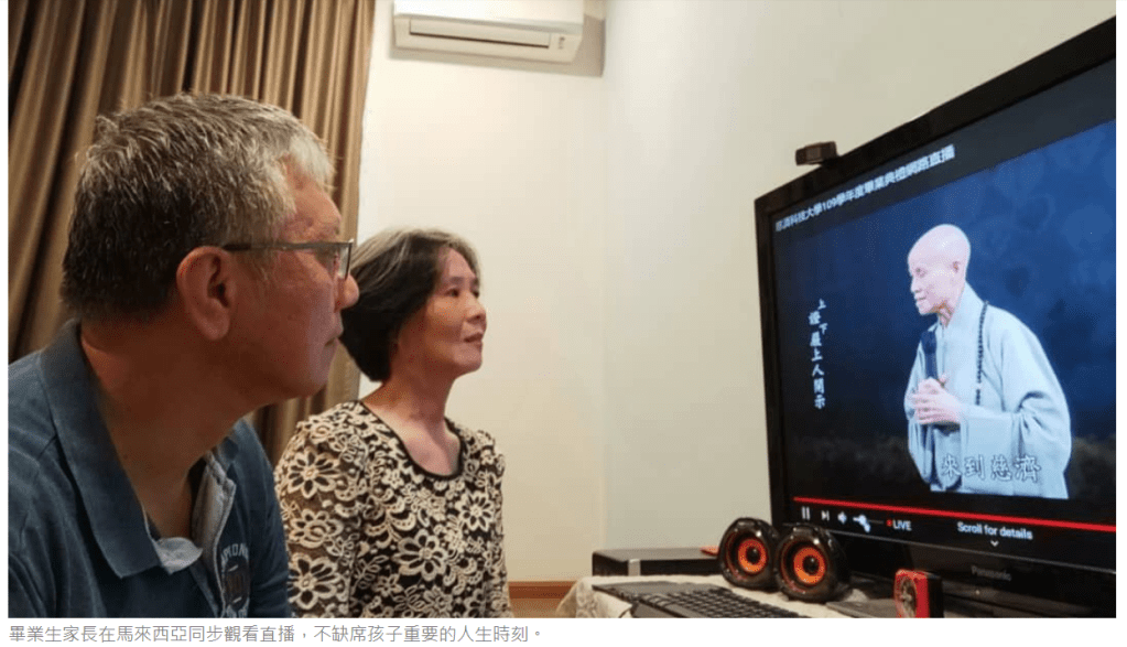 來自馬來西亞的護理系畢業生許緯芳表示,原本爸爸媽媽規劃搭機來台參與畢業典禮,結果,改為線上播出,又少了師長親自撥穗,難掩失望情緒。護理系畢業生林禹廷表示,受到疫情影響,儘管不如預期,但是四年專業所學並沒有因此改變,期許自己能一步一腳印朝著目標前進。同步在馬來西亞觀看線上畢業典禮的家長陳淑玉,能在疫情如此嚴峻的時候,還有機會一起見證孩子的畢業。心裡充滿著一陣又一陣的感動,更深刻感受到慈濟人文和感恩的素養。