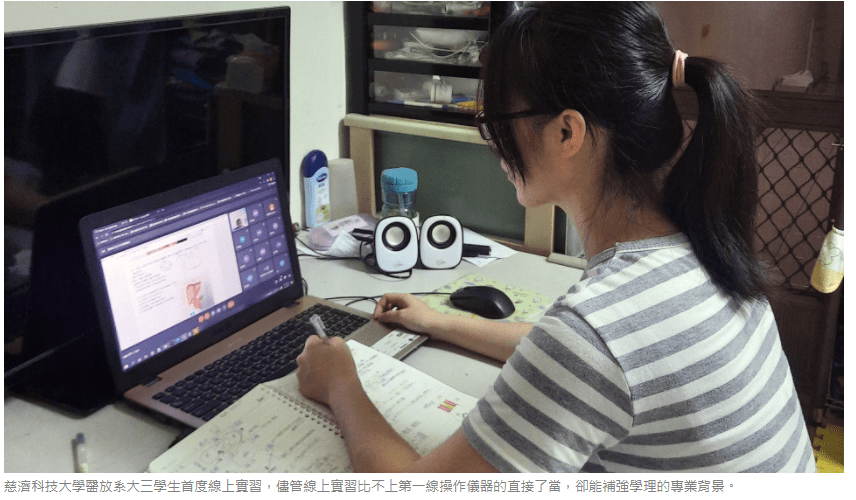 參與台大醫院線上實習課程的醫學影像暨放射科學系三年級學生蔡宜蓁表示,儘管線上無法完全取代實體,但是醫院也特地安排入院前必須瞭解的相關資訊,像是臨床知識、案例討論等,等於是為八月實習做好了銜接準備。參與慈濟科技大學線上實習課程的醫學影像暨放射科學系三年級學生楊麗敏表示,透過密集的線上課程,才發現自己事前準備不夠,像是技術的嫻熟度、解剖構造的熟悉度等。所以,改變了原先的複習計畫,也慶幸多了一個月的緩衝,才能將三年的課堂所學,應證於臨床實務上。