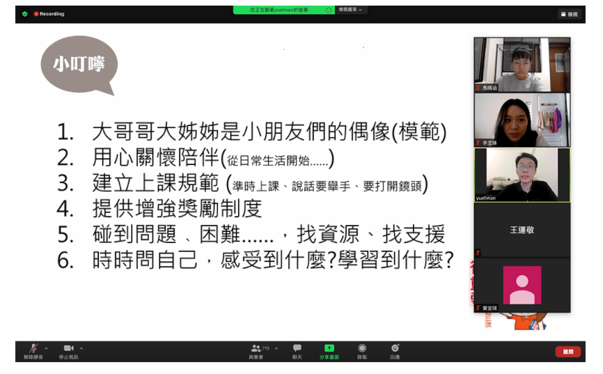 就讀慈濟大學教育研究所的林亼鈺同學,選擇以志工的方式參與此計畫,她表示參與青年線上伴學趣計畫,線上的服務不只是服務的型態改變了,更多的是磨練不同面向的能力。在線上服務的過程中,有挫折、有感動,還有許許多多與小學伴之間美好的回憶,看見一個孩子成熟與懂事的身影,真的很感恩有兩個月的時間陪伴這幾位孩子走人生的一段路,這是一段生命影響生命的歷程。兩個月的時間除了看到每一位孩子的生命與學習,對於自己而言也是一大成長,首先是在與孩子交流中的成長,從看到每一位孩子的生命與孩子們的努力學習、積極面對生活,更加了解教育愛的心情;其次,在安排課程的過程中,磨練自己課室經營以及教案設計與帶領的能力;最後,在與大學伴之間的互動,引導著我看見自己的不足,並且學習彼此的優點,精進自我教育路上的能力。