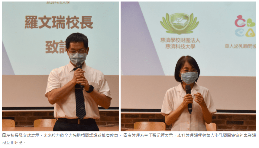 慈濟科技大學校長羅文瑞表示,護理系產科護理課程和華人泌乳顧問協會推廣的母乳哺育很有關聯,未來校方將全力協助相關認證或推廣教育。華人泌乳顧問協會理事長王淑芳表示,不論是泌乳照服員、泌乳指導、泌乳顧問證照,都需要完成16至48小時的泌乳支持課程,再通過筆試和技術考才能取得認證。未來希望從學校教師開始推動,讓醫護人員更有系統地養成泌乳支持能力。