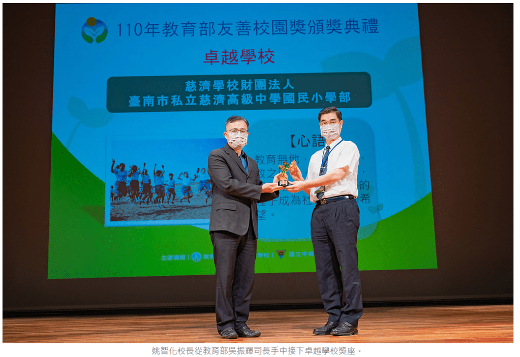 臺南慈中國小部今年榮獲110年度教育部友善校園卓越學校,全國只有兩個國小獲獎,更是臺南市唯一獲獎學校。