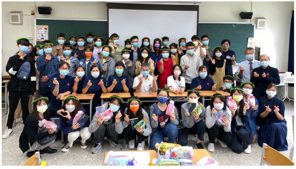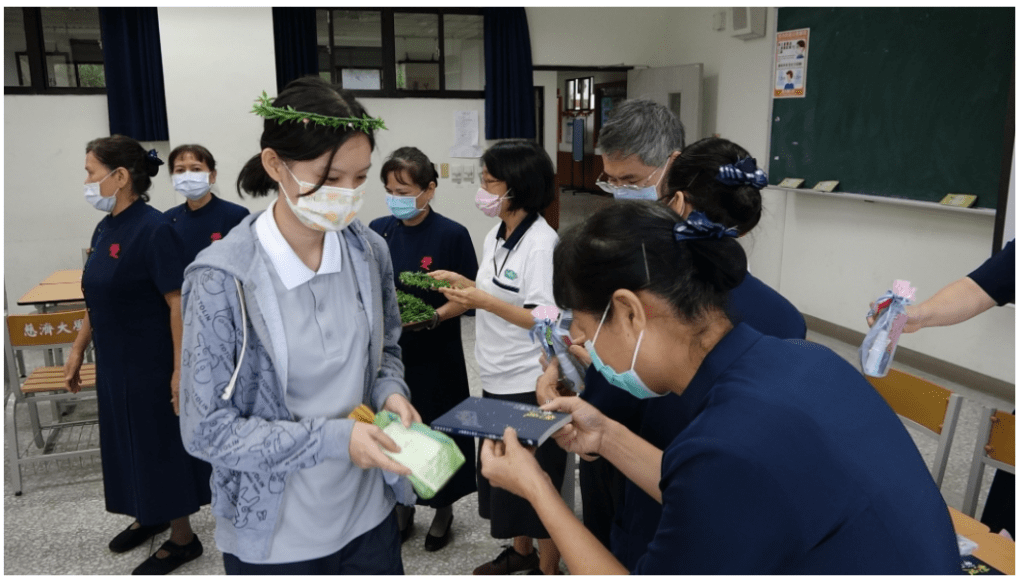 慈誠懿德爸爸、媽媽為孩子們舉行溫馨的「成年禮讚」,由老師為同學戴上花冠,慈誠懿德爸爸、媽媽特別為孩子們準備六樣見面,包括:吊飾「愛」、巧克力、書、筆、鑰匙、酒精,六樣東西各具特別意義。