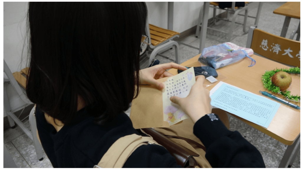 活動尾聲,邀約同學們寫信給家人,低頭埋首寫家書,道感恩、報平安,有人停頓思考,有人振筆疾書,有人偷偷拭淚,有人歡喜又快速完成。品嚐著點心和水果,是爸爸、媽媽帶來的愛,聊著開學後的點點滴滴,歡笑聲中結束初次的見面,但彼此間距離更近了,微笑的眼神道再見,滿心期待下個月的再相見。