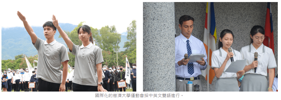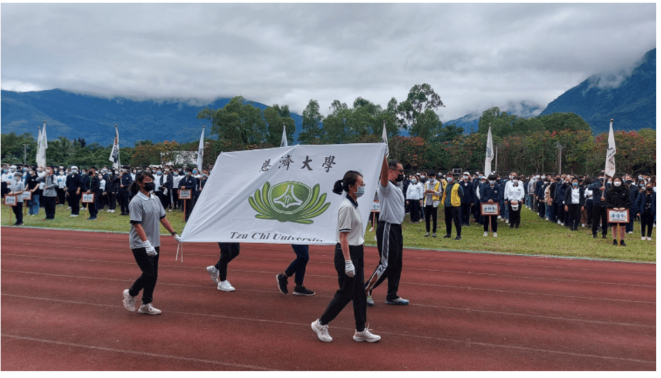 慈濟大學1994年在花蓮創校,從最初只有130多位學生,到現在已經有3348位學生,還有26個國家的國際生,今天運動會開幕典禮,展現國際化、在地化和多元文化的特色。