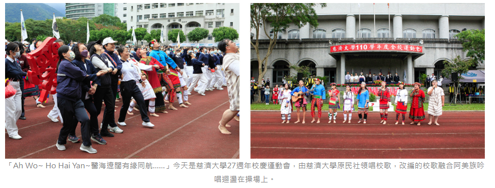 「Ah Wo~ Ho Hai Yan~醫海遼闊有緣同航……」今天是慈濟大學27週年校慶運動會,由慈濟大學原民社領唱校歌,改編的校歌融合阿美族吟唱迴盪在操場上。