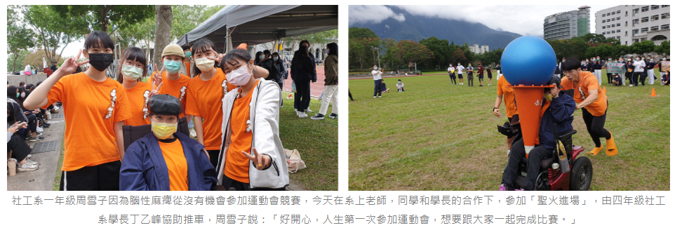 運動不分年齡,樂齡班的同學全力投入趣味競賽中,72歲的黃欣維表示,能夠全班一起參加,一起運動,對他們來說好玩比成績更重要。社工系一年級周雪子因為腦性麻痺從沒有機會參加運動會競賽,今天在系上老師,同學和學長的合作下,參加「聖火進場」,由四年級社工系學長丁乙峰協助推車,周雪子說:「好開心,人生第一次參加運動會,想要跟大家一起完成比賽。」