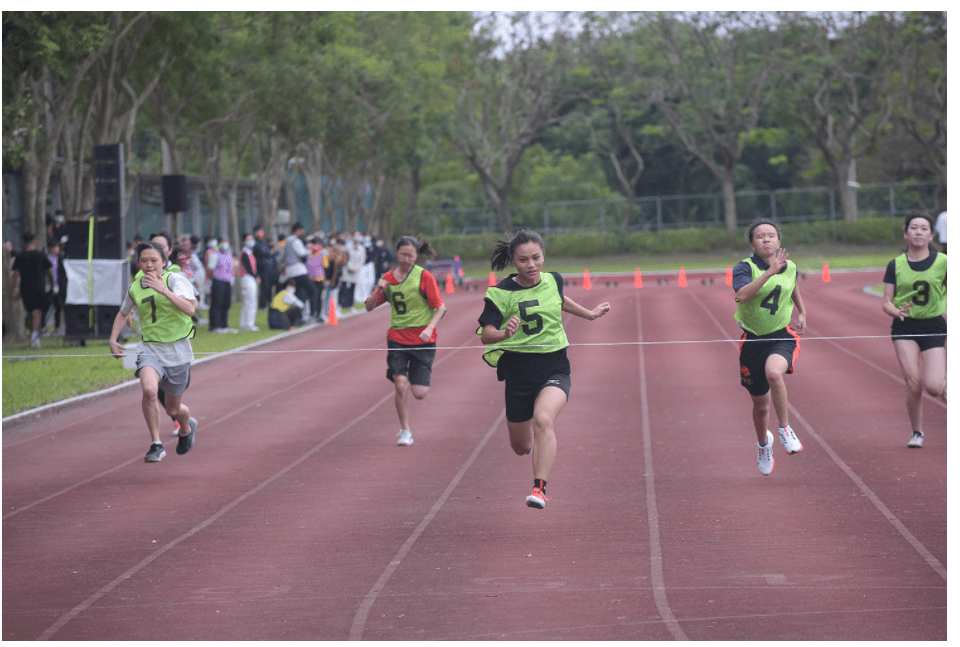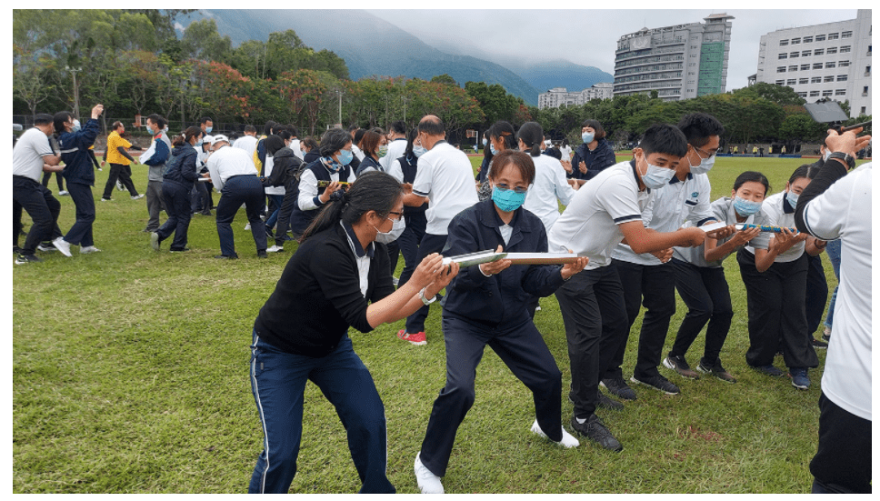 由教職員的趣味競賽「心手相連」開始今天的比賽,「心手相連」考驗同仁之間默契和團隊合作,透過比賽凝聚大家的向心力,一起為校務努力。緊接著進行學生組100公尺、200公尺、400公尺決賽以及大隊接力等競賽。