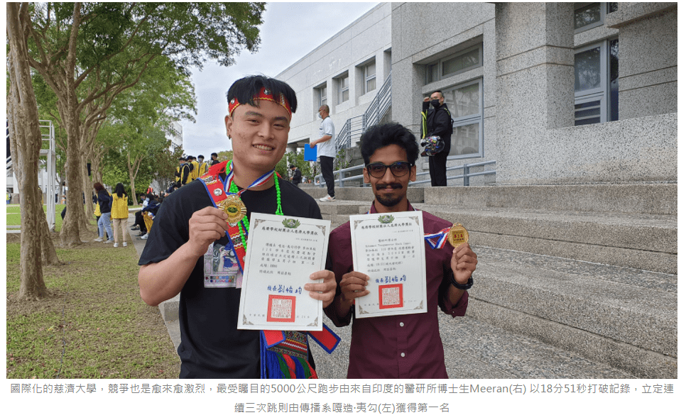 國際化的慈濟大學,競爭也是愈來愈激烈,最受矚目的5000公尺跑步由來自印度的醫研所博士生Meeran 以18分51秒打破106學年度楊子明締下的 19分20秒紀錄。Meeran表示,花蓮的空氣很好,在花蓮跑步非常舒服,他每天練跑希望能夠為自己留下好成績。立定連續三次跳則由傳播系嘎造·夷勾獲得第一名,嘎造表示,運動對他來說很重要,可以讓他放鬆心情,嘎造也拿到1500公尺跑步第二名。