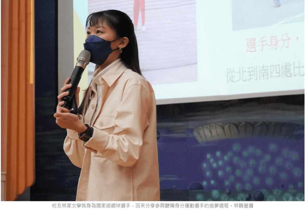 儘管家文因聽力受損導致表達口音無法清晰,但全場師生以安靜和專注來試圖瞭解內容,此外,透過圖片和影片也讓大家看到她一路走來參與國內外運動賽事、克服運動傷害並晉升國家級選手的艱辛歷程 (註4) !