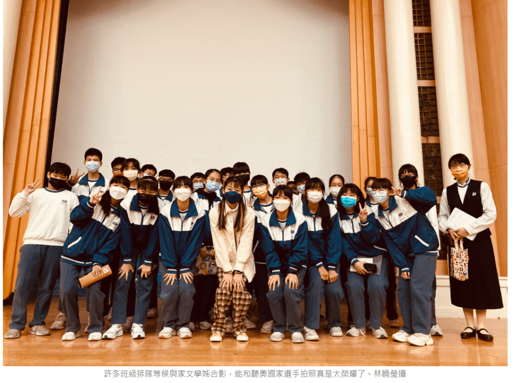 國二黃子軒同學在演講結束後,鼓勵全班一起與家文學姊合影,因為學姊遇到困難都不放棄的精神令人非常感動。此外,擔任講座司儀的國二黃崇恩同學更是近距離聽家文學姊分享,崇恩同學敬佩家文學姊盡全力做一件事(網球),自己也應把學姊努力的樣子當成一種典範來學習!
