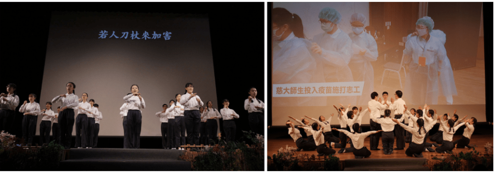 由二十位同學演繹無量義經德行品,透過合齊的肢體動作,帶領大家體悟「六度」(布施、持戒、忍辱、精進、禪定、智慧)的精神,並一起走入2021年慈濟大學的大事紀。回顧校園點點滴滴,慈大研發試劑捍衛全民健康、並加入疫苗施打志工、在臺鐵太魯閣號事件的關懷、偏鄉服務等都沒有缺席,慈濟大學校長劉怡均表示,感恩慈大師生,不管在服務,抗疫上都用心投入歡喜承擔,貢獻所學回饋社會。