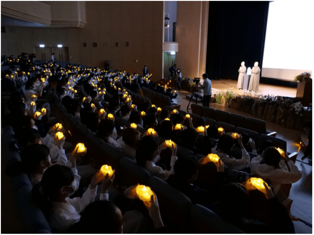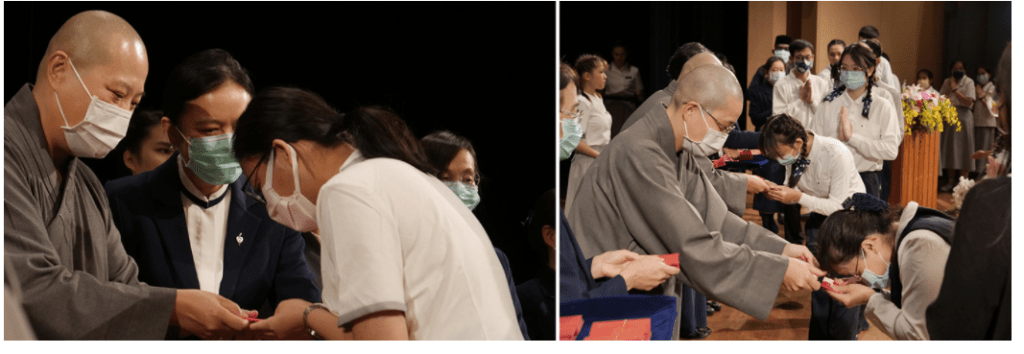 慈濟大學師生於24日在大愛樓演藝廳,領受由精舍德江師父、德澧師父代表證嚴上人致贈的福慧紅包,同時也凝聚大家的善念,點亮人人的心燈,虔誠祈禱2022年疫情消弭,社會祥和,天下無災,人人平安吉祥!