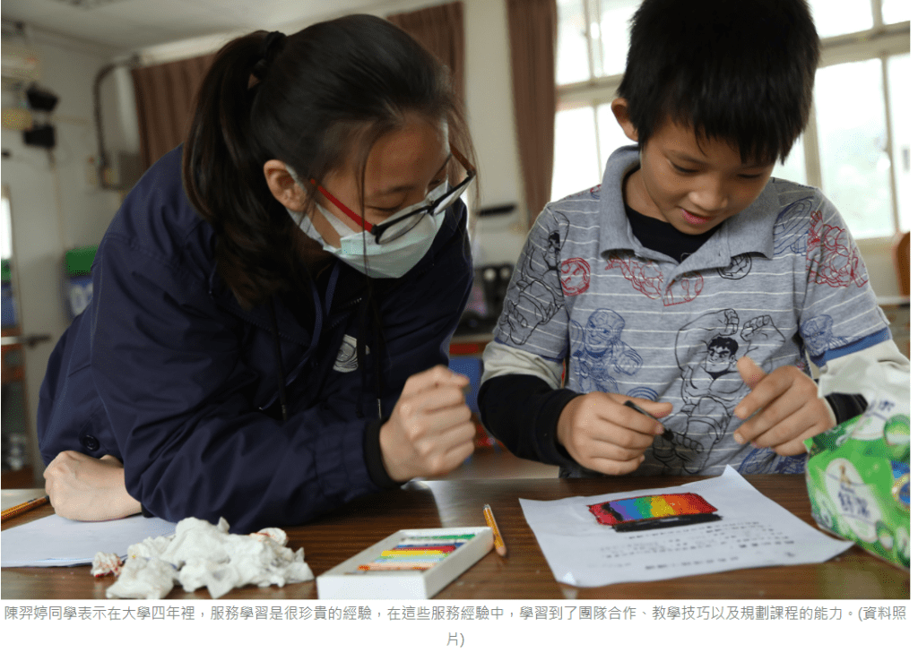 兒家系陳羿婷同學表示在大學四年裡,服務學習是很珍貴的經驗,在這些服務經驗中,學習到了團隊合作、教學技巧以及規劃課程的能力。在服務過程中,也可以學習學長姐站在台上跟孩子互動的技巧,不斷地修正和改進,並將這些學習再傳承給學弟妹,形成善的循環,同時也了解最重要的是用心陪伴孩子,讓他們在服務的時間裡能夠感受被關懷和被在乎,讓孩童擁有一個快樂的時光。