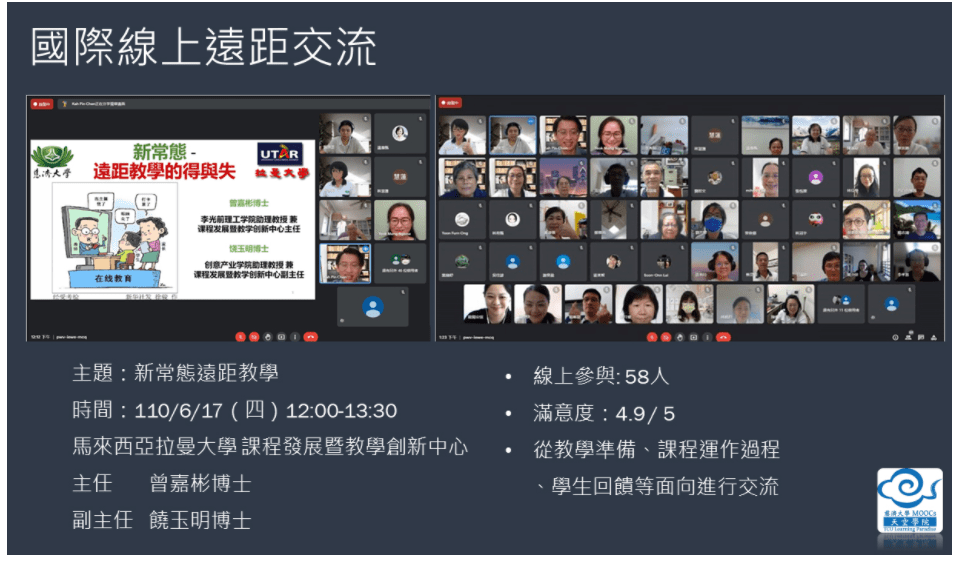 2021年6月,適逢台灣新冠肺炎衝擊最嚴峻的時刻,大多數學校皆採取遠距教學上課,同時也進行分流上班,然而網際網路卻不會因此受影響,學習依然持續進行中。慈濟大學教師發展暨教學資源中心與拉曼大學課程發展暨教學創新中心,運用網際網路,連結跨區域的交流,共同舉辦跨國際遠距教學線上交流座談,此時,馬來西亞已停課近一年。交流討論議題從教學設計、教材準備、課程運作以及學生回饋等面向,相互交流;讓台灣才剛停課兩周的教師們,從中獲益良多,同時對雙方數位學習教育與學習者行為有更深的探究。