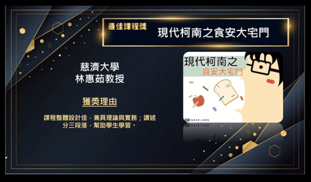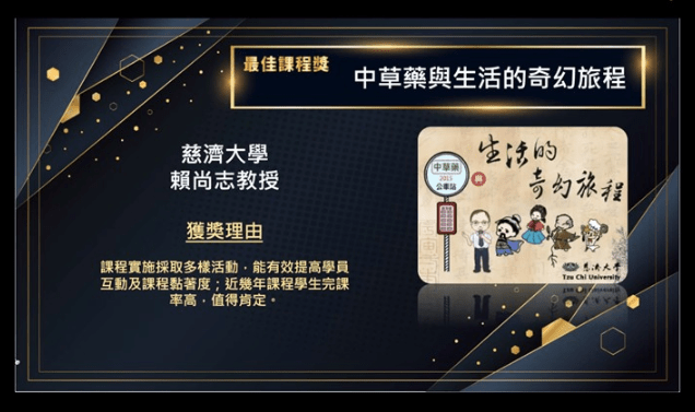 教育部辦理2021年磨課師標竿課程甄選,得獎名單出爐,慈濟大學以「現代柯南之食安大宅門」以及「中草藥與生活的奇幻旅程」獲得最佳課程獎殊榮,也是全國唯一獲得二項「磨課師標竿課程獎」之私立醫學大學。