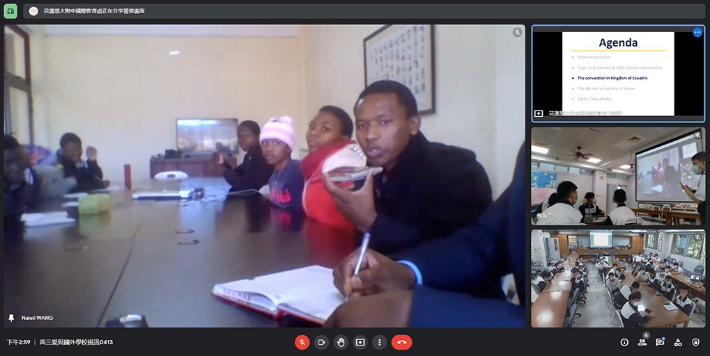 此次交流前雙方教師透過線上共備,研擬課程主題,測試彼此的器材,一切準備就緒。開始交流時,慈中國際教育處鄭振宇組長先以英文介紹今天活動的主題,也介紹花蓮慈大附中,隨後,圓通中學校長Mr.Mdluli也介紹了校園環境讓慈大附中的同學認識,同時也分享了史瓦帝尼傳統習俗。校長說,史國的同學面對年長者時,不能直視對方。雖然西方禮儀講究和別人講話要有眼神交流,但是對於史國的同學而言,尊重對方,是要低著頭,仔細聽對方說話,才是禮貌。此外,史國的Dalmini Mayibongwe 清心同學也分享自己就讀的環境以及學習狀況,先是用英文表達,隨後以流利的中文,和慈大附中的同學交流。看到圓通中學的功夫影片,讓慈中的同學讚嘆不已,身為國術隊一員的慈中葉承恩同學看著他們整齊劃一的動作,氣勢十足,震撼了他。除了驚訝於他們一口流利的中文之外,也看到他們紮實的中華文化。