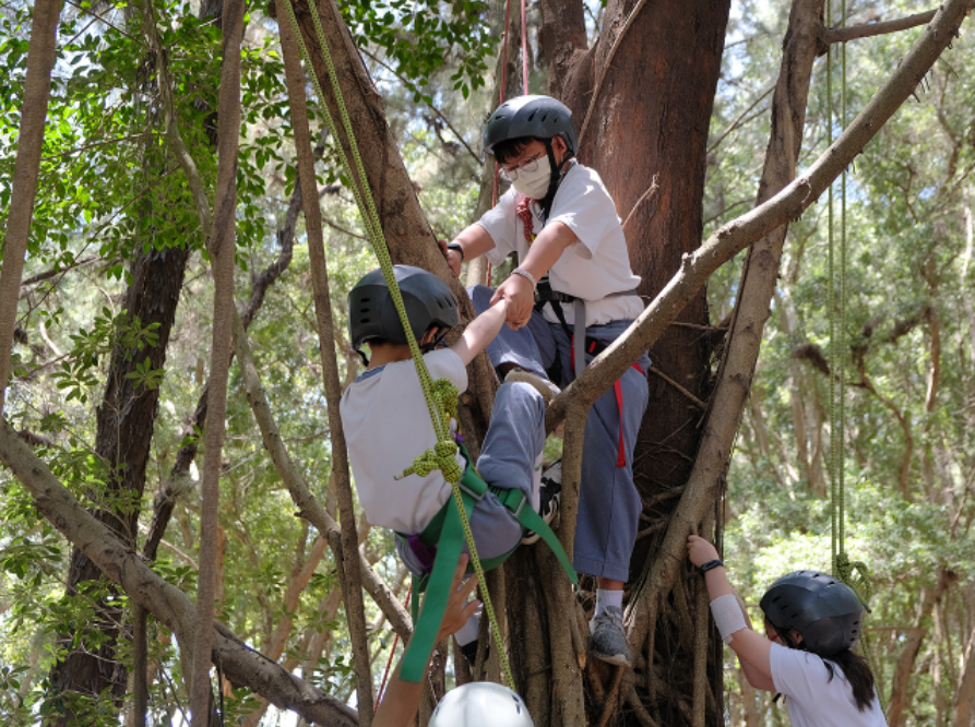 接著是跨出戶外課程的重頭戲:攀樹。孩子們在教練的引導下,運用繩結、掛勾,靠著手腳並用的力量和協調度嘗試繩索爬、徒手爬二種不一樣的體驗,四包容劉其娣表示自己喜歡嘗試刺激的事物,並不害怕爬樹,但是攀樹可沒有想像中簡單,一定要專心聽從教練的指導才能順利又安全的完成挑戰。生平第一次爬樹的四知足吳沛頤,剛開始其實很害怕登高又擔心受傷而猶豫不前,不過沛頤最後告訴自己要勇於挑戰,在教練一步一步引導下,終於戰勝恐懼站上樹間,頓時有了無比信心和再挑戰一次的勇氣。
