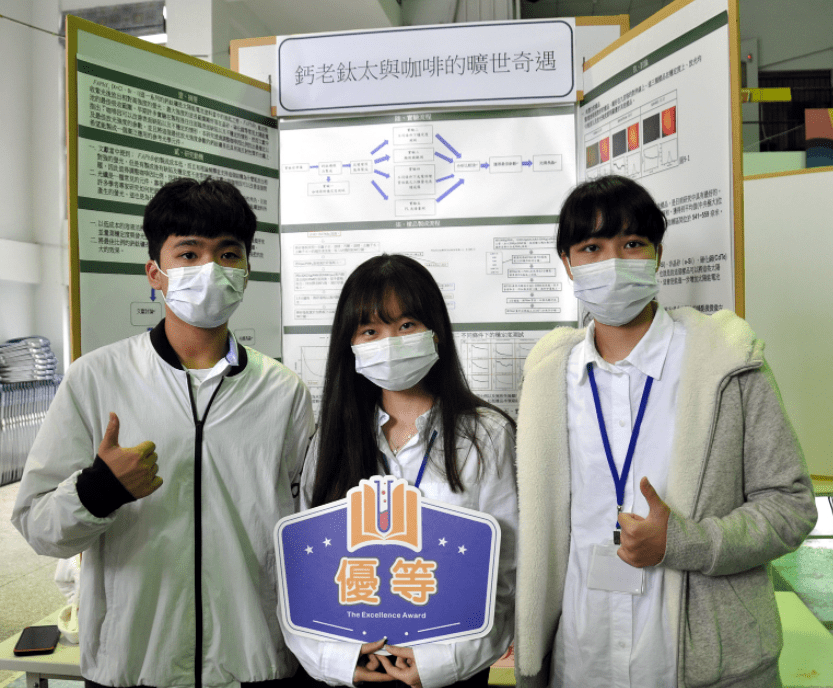 本屆獲獎的四件作品,分別是:周佳儒與詹淳茹兩位同學的作品「食物對黃斑黑蟋蟀社會互動行為之影響研究」,獲得動物與醫學學科組特優,由林麗君老師指導;羅雁慈、蔡銘煜、朱品函同學的作品「鈣老鈦太與咖啡的曠世奇遇」獲得工程學科(二)優等獎。