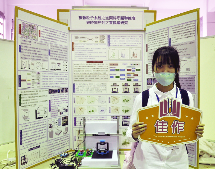 由陳秋樺老師指導;吳懿恩同學的作品「複雜粒子系統之空間碎形關聯維度與時間序列之置換熵研究」獲得物理與天文學科組佳作,由柯政宏老師指導