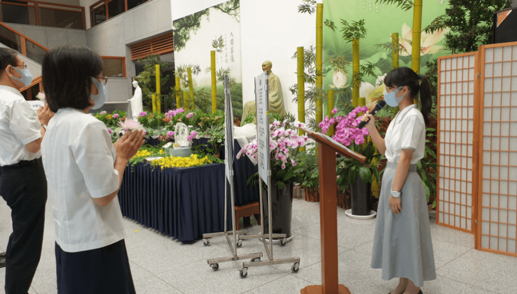 「禮佛足,誠齋戒,祝福吉祥。」浴佛典禮由物理治療學系三年級陳品怡擔任司儀,陳品怡表示,希望透過浴佛典禮帶給大家心裡的平靜,聚集大家的善念。因為身邊有些同學也被疫情影響,陳品怡也希望疫情能夠趕快結束生活回到正軌。