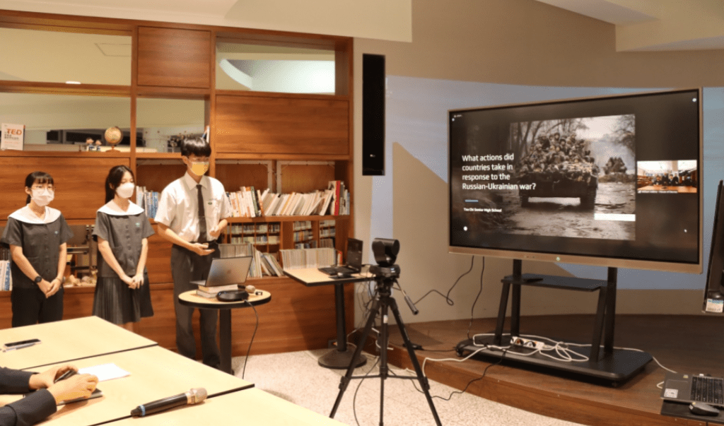 慈中駱玟婷同學認為,這次的視訊交流有別以往參加過的任何一場交流活動,談論的不是彼此的文化、風俗,而是生硬的國際時事—俄烏戰爭。從小規模的會前會再到正式的交流,過程中一次次的修正報告內容、找資料、改文法,用我們比較不熟悉的英文進行簡報,並且提出疑問與看法,真的從中獲得許多練習與英文母語者對談的機會。柯劭穎同學則表示,這次的交流,不僅讓自己對於烏俄議題有更深入的了解,也有機會用英文提問及回答,是訓練思考與語言的難得機會。印象最深刻的是歐巴馬中學同學有問到台灣媒體對烏俄戰爭報導的問題,這讓自己思考是否因為媒體資訊的不對等而產生偏見與誤差。