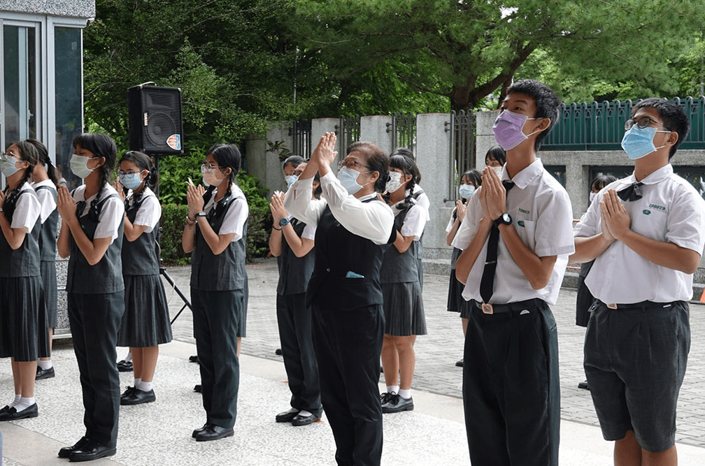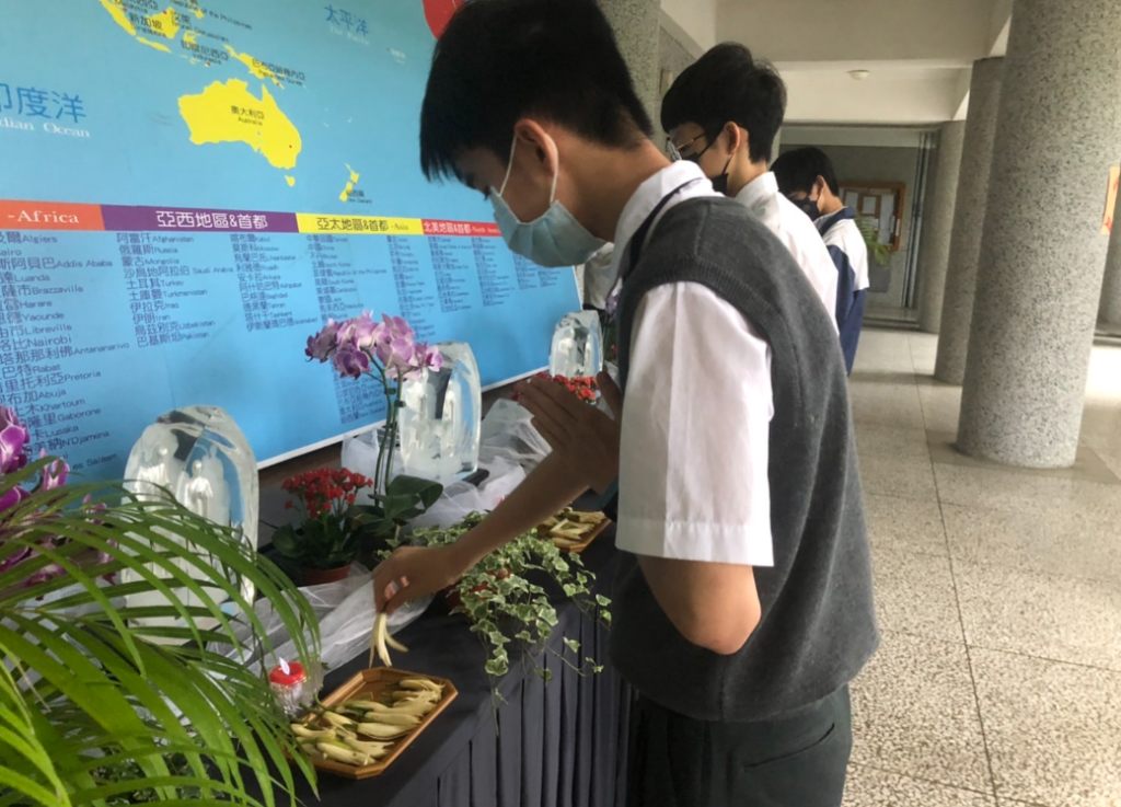 五月十二日在李玲惠校長與校內主管的帶領下,虔誠獻上燈燭與花香,在校內透過雲端連線開啟浴佛的序幕,為避免群聚與感染風險,分別於十二日、十三日舉辦多場班級的小型浴佛,全校師生用最虔誠恭敬的心,祈願戰爭、疫情早日消弭。