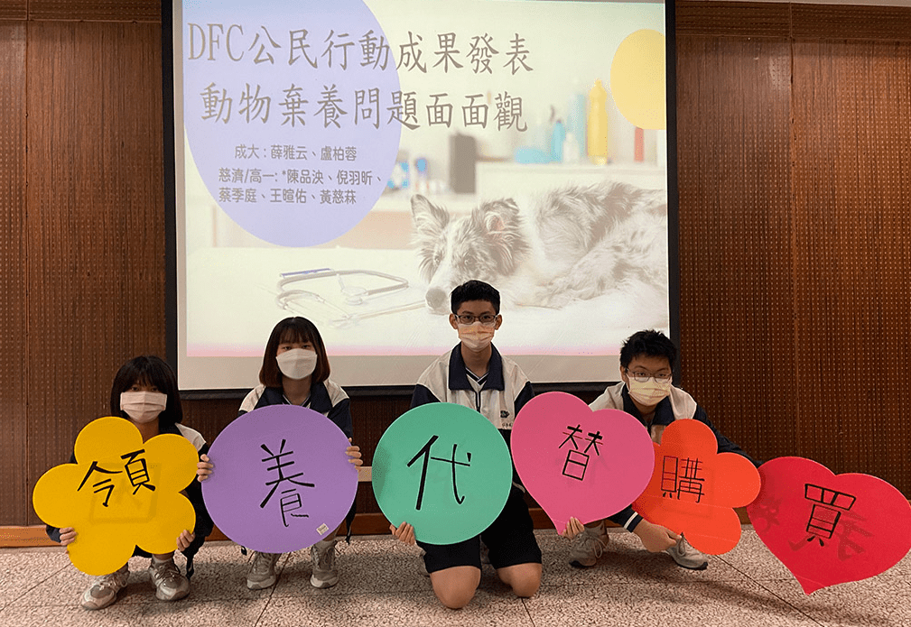 臺南慈中在108學年第一學期試行多元選修開課時由學校公民科陳青慧老師及林昱汝老師將DFC(Design For Change)和「公民行動方案」(Project Citizen)兩種強調觀察、省思、探索及行動的學習策略結合,發展出「DFC 公民行動」高一多元選修課,課程核心契合108課綱教育改革精神鼓勵學生多元探索、跨域學習,並透過素養導向增進知識活用與實踐的能力,本學期第四次開課由歷史科李嘉祥老師及公民科林昱汝、吳宗原老師共同授課。