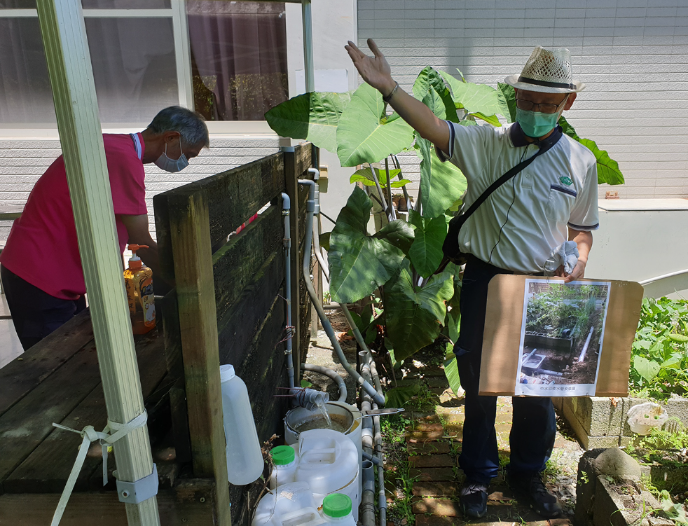 碧雲莊活動中心由於平時會舉辦許多活動,社區廚房的廢水排放量增,洗菜、洗碗後的水流入水溝,讓原本水溝裡的魚消失了,也增加蚊子數量。為了回到原來的生態,同時兼具社區活動中心的功能,在與社區成員大家共同討論後,邱奕儒老師設計「中水回收系統」,廚房的廢水裡有菜渣、有殘油等,利用三個水桶過濾進行「油水分離處理」再透過礫石中的滲透管流入土壤,再經土壤微生物分解後提供社區菜園作物所需的水與養份。