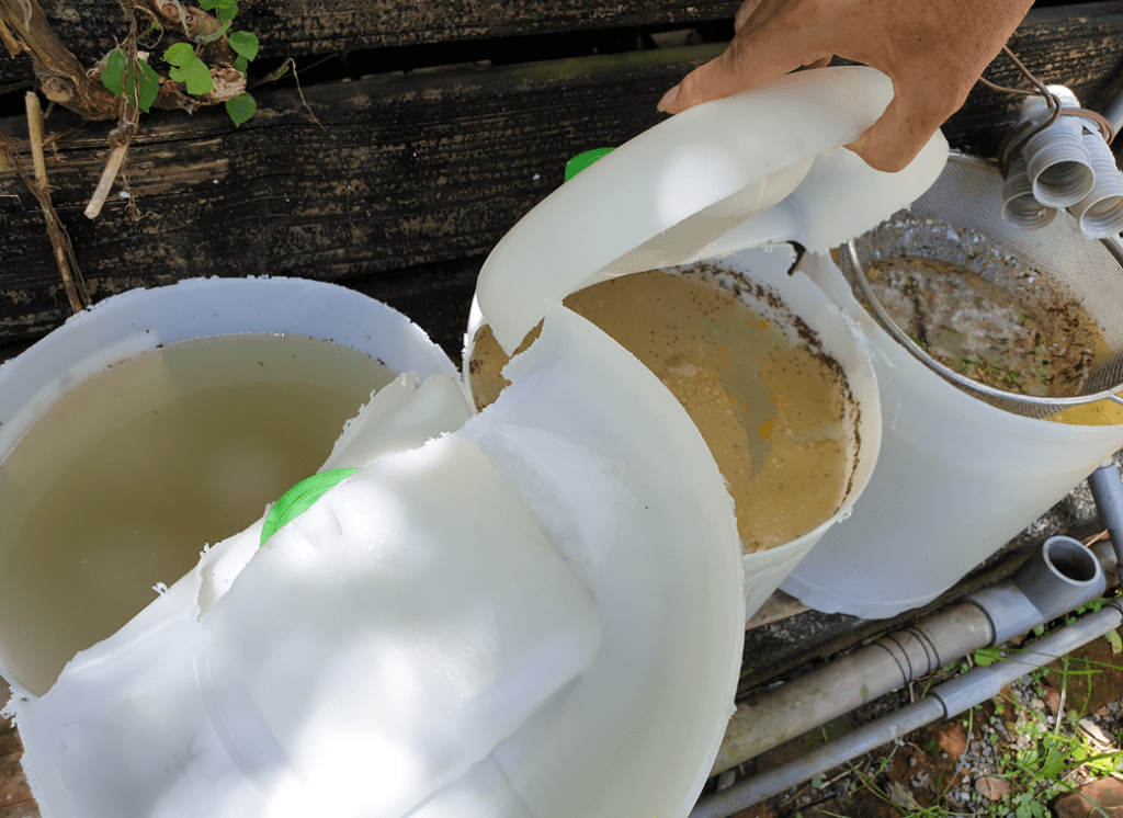 「利用油會浮在水面上的特性,所以第一個水桶有過濾系統,上面有浮油,到了第二桶油變少了,第三桶時我們甚至看不到油。」邱奕儒老師指著自製的簡單油水分離系統,利用三個飲料店廢棄的果糖罐,就能將廚餘水過濾,拿來澆花灌溉,甚至減少衛生下水道的負擔。