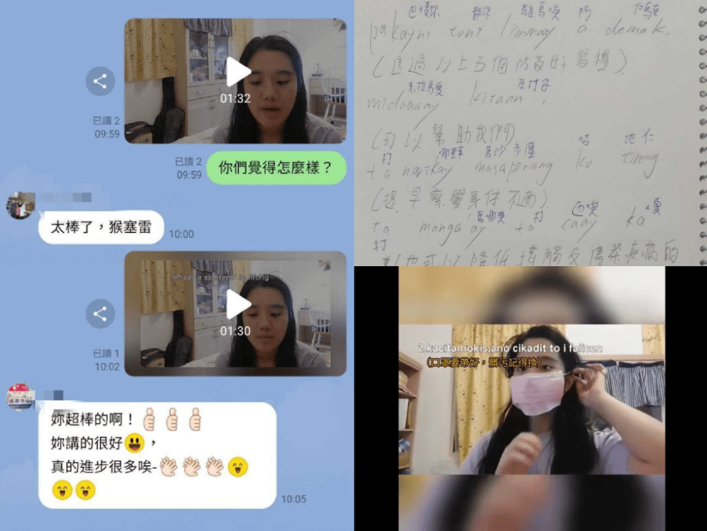 護理科二年級學生高琪(阿美族原住民)表示,影片完成後,上傳到家族群組,獲得滿滿的鼓勵。連阿嬤都說,「孫女長大了,會講更多族語了!」以後進醫院實習,也能和原住民病患多溝通,增加了語言的優勢。護理科三年級學生谷佳恩(布農族原住民)表示,學母語是一件很快樂的事,不但能肯定原住民身份,更能傳承部落文化,還能意外聽懂長輩聊天的八卦!