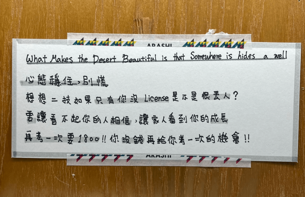 「再考一次要1800元!你沒錢再考一次!」、「如果二技只有你沒有執照,是不是很丟人?」、「無愧於父母,自己及愛自己的人!」看似惡毒卻超有共鳴的厭世心靈毒雞湯,全都是考生寫給自己的激勵小語,並貼在書桌前,時刻警惕自己不能鬆懈。