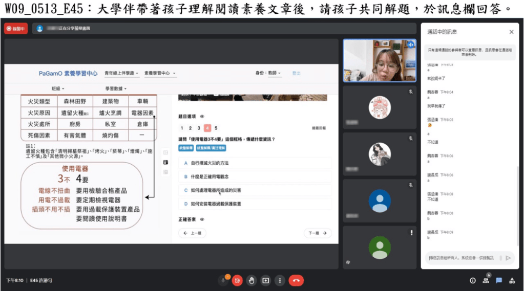 教育是「終身學習」、不斷成長且能回饋他人與社會的歷程。藉由青年線上伴學,培養弱勢兒少的學習動力與生命韌性,透過數位工具學習閱讀、英語、數學與人文,涵育自主學習、友善利他等。因天災與疫情的影響,數位線上學習已逐漸成為一種趨勢,不僅提供學童多元的學習資源,同時也讓弱勢或偏鄉學生透過教育改變命運,藉此翻轉其人生。
