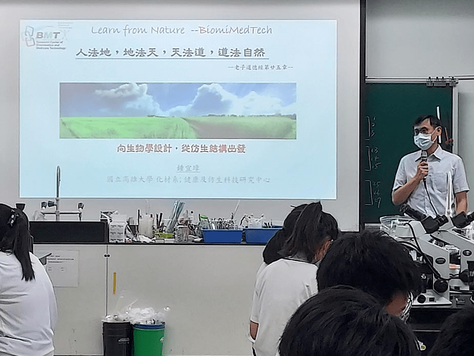 國立高雄大學化材系鍾宜璋教授,特地帶著研究團隊來到臺南慈中,與數理實驗班的同學分享仿生結構與生活科技應用探討。該研究團隊的「仿生膠帶」曾在2019年獲頒科技部「未來科技突破獎」,本次更以仿蝸牛膠帶與膠水,帶領數理實驗班的同學進行實作與觀察。