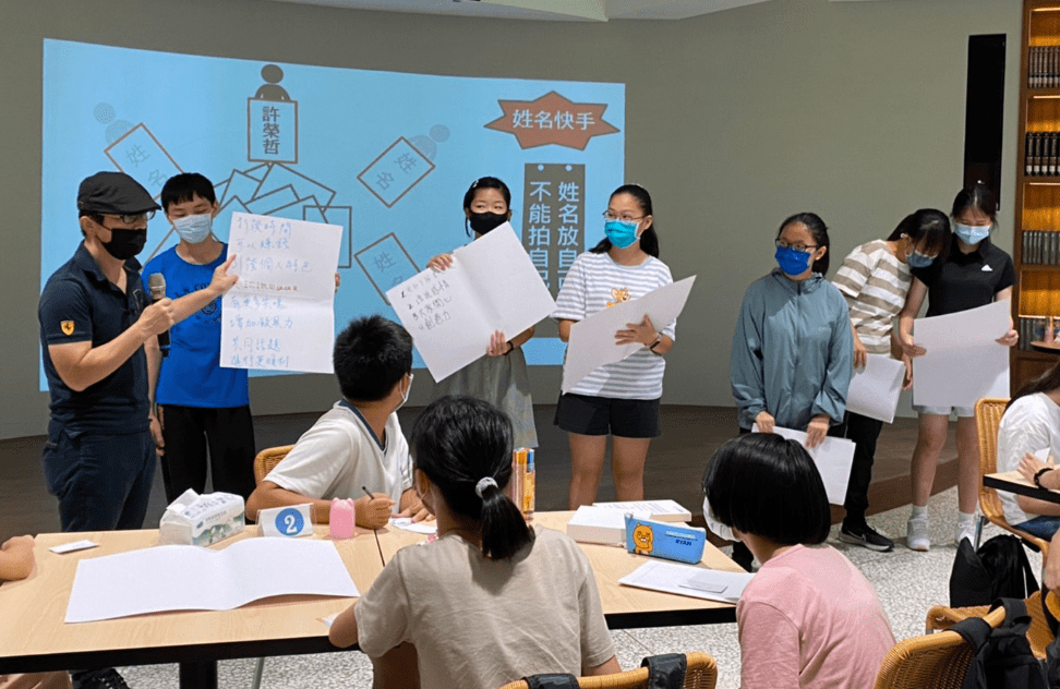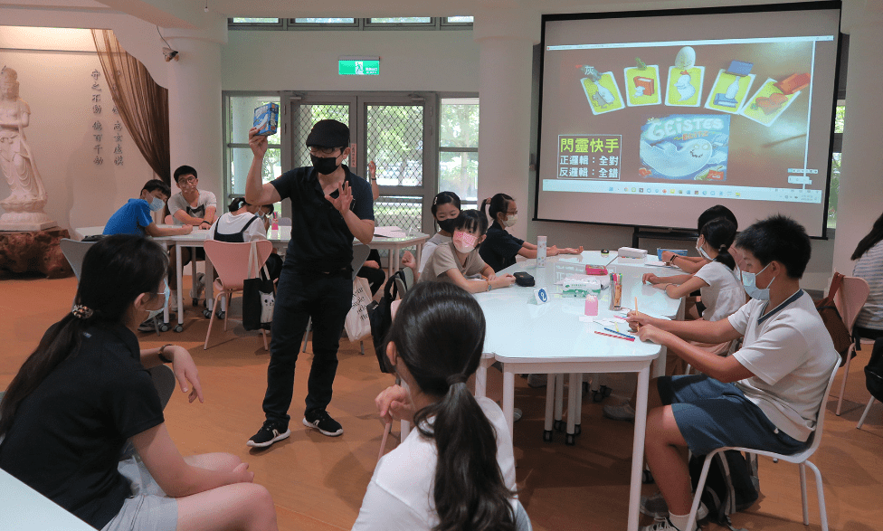 許榮哲老師先以「二真一假」介紹自己,再請同學模仿心臟病的方式,用「姓名快手」快速展現同學的特色與編故事的能力。透過小組聚焦討論,同學認為玩桌遊能獲得向心力、觀察力,除了與同儕創造共同話題,甚至能透過故事學習表達。
