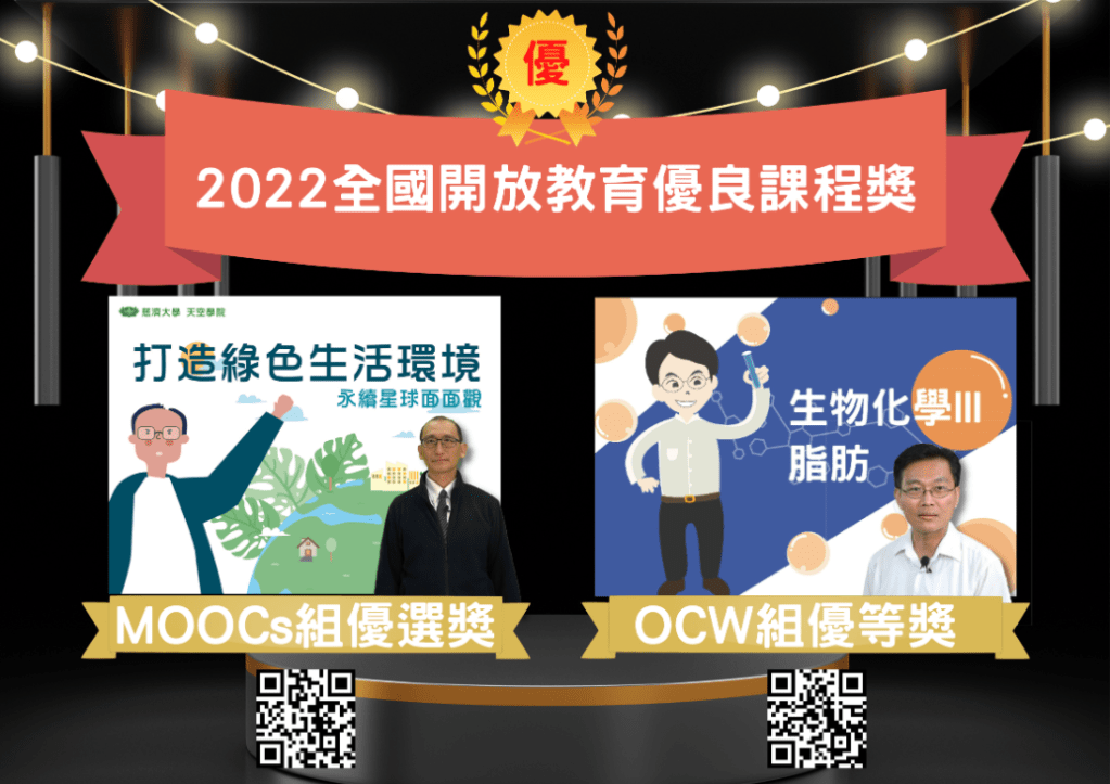 2022全國開放教育優良課程徵選,分為磨課師課程組 (Massive Open Online Courses) 以及開放式課程組(OpenCourseWare),超過60所以上的學校參與徵選,競爭激烈。慈濟大學「生物化學III~脂肪大觀園」獲得優等開放式課程獎,以及「永續星球面面觀~打造綠色生活環境」獲得磨課師課程組優選獎,這也是慈濟大學天空學院第三度榮獲「2022全國開放教育優良課程」獎項。