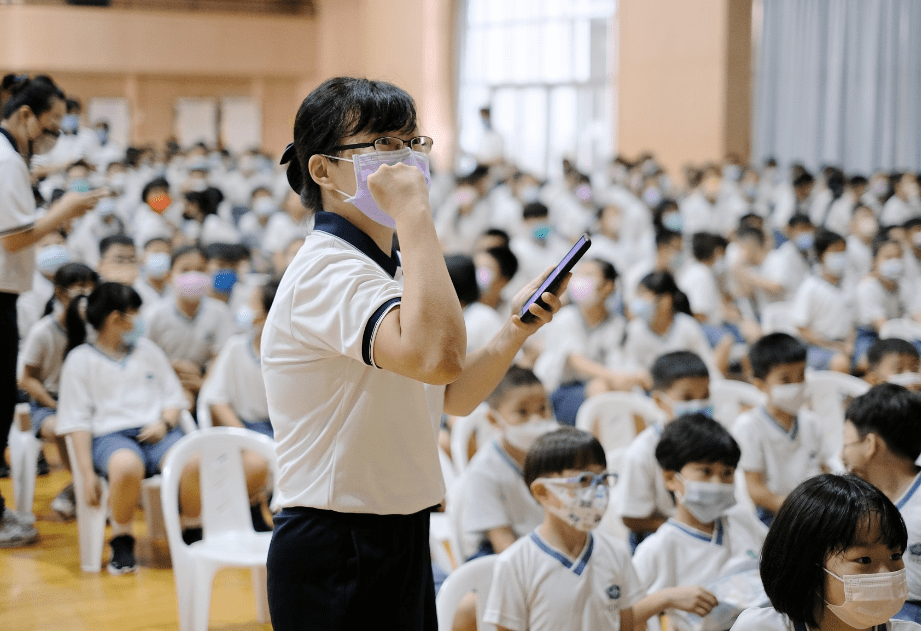 誰說開學不好玩,今年的開學典禮,一開場就來個「慈小猜歌王」遊戲,當司儀老師一聲令下播放音樂,「地球的孩子」、「幸福的臉」,甚至是放學歌「發好願說好話」都成了考題,當熟悉的旋律才剛響起,孩子們就紛紛抓到答案的線索,各個胸有成足的轉頭向導師示意,各班導師透過線上平臺Google classroom,既正確又快速的上傳答案,當班級導師終於搶得前五名時,全場頓時歡聲雷動,為導師的「快手」歡呼鼓掌,真是刺激極了!