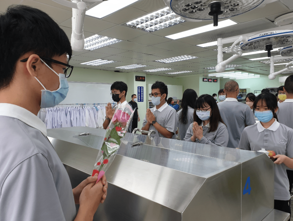 醫學系和後中醫學系的同學,為每一位老師準備一杯茶,一朵花,一顆蘋果,還有老師生前喜愛的東西,大家雙手合十,彎腰鞠躬為老師奉茶,感恩老師。第四組江淑慎老師的學生車贊文同學說:「我們很幸運可以幫淑慎老師完成再當老師的心願,我們會努力學習,不辜負老師的期望,祝福江老師教師節快樂!」醫學系江奕臻同學說:「透過解剖學科老師的教導,讓我們從無語良師身上看到在解剖書上的人體構造,感恩老師讓我們在醫學路上成長。」