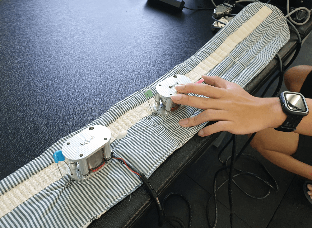 「腹腰部深層肌肉穿戴刺激裝置」是由楊志鴻老師與物理治療學系碩士班和學士班的同學們一起設計,先從學校的游泳選手進行測試,發現確實能改善運動表現效果後,進一步與張育銘教練合作。該項裝置已獲得國內發明專利,目前仍等美國發明專利通過。其原理是利用外在隨機振動刺激方式,進行腰部深層肌群活化控制之效果,強化腰部動態控制的能力,進而提升運動功能表現。從診斷式超音波的圖片清楚看到經過15分鐘的振動刺激後,受測者腹橫肌的收縮範圍變長,可以更有效的控制肌肉活化。