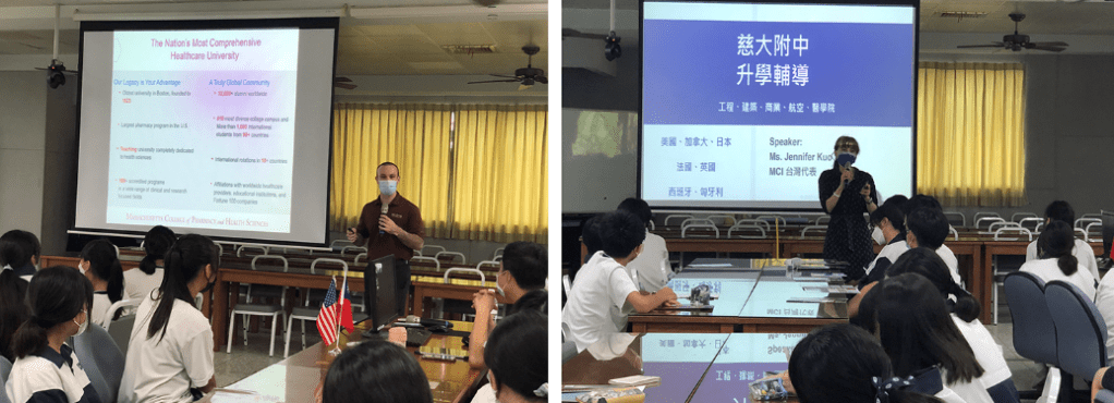 在招生說明會中,Mr. Friedman向四十多位與會的高中部同學介紹MCPHS這所學校的各個科系、特色及申請入學方式。會後還跟有興趣就讀醫藥衛生相關科系的同學進行深入會談,並依學生期待的專長技能做大學科系的建議。他對於慈中學生的英文程度及積極探索未來志向感到印象深刻,也十分肯定慈大附中長期致力打造學生全球素養及國際移動力。