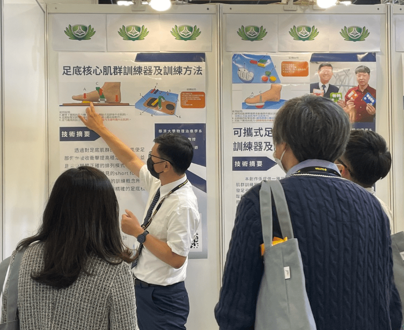 慈濟大學物理治療學系楊志鴻教授研究團隊「可攜式足底核心肌群訓練器及訓練方法」,幫助使用者訓練足底肌肉群,提高腳底穩定的能力,結合預防醫學、運動科學以及樂齡延緩失能之領域,可攜帶之訓練設備,輕便容易收納,使用不受場地與環境限制,投入青少年競技運動員以及高齡醫學等領域臨床應用,可依據使用者腳型調整,並因應訓練需求設定強度,獲得銅牌肯定。