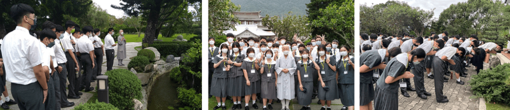 第二天下午,即是臺南慈濟高中戶外教育最具特色的行程──精舍巡禮。對大眾而言,精舍是臺灣最具代表意義的佛教聖地,於南慈中的學生而言,更像鮭魚返鄉的精神回歸。精舍師父們事前知悉參訪行程,及早備妥迎接,帶著溫煦微笑在大殿前等候。巡禮過程中,師父們更是暖聲招呼,攜手同學們漫步精舍各處角落,就像引領兒孫細數珍寶,無論是講慈濟故事、談生命哲學,還是論生活佛理、道精舍日常,精舍師父們舉手投足間,展現於孩子面前,都是極親近的關照、至貼切的智慧。或許各人慧根有深有淺,領授者得到的寶藏不盡相同,但師父們一見到「臺南回來的孩子」,便閃亮起的眼神,卻是南慈中師生最共通也最直接的感動。高二知足王恩理同學表示:「自己一路從慈濟小學讀到高中,雖然是二度參訪精舍,依然收穫滿滿。藉由師父的解說與故事分享,更讓我認識慈濟的精神與理念;師父們的熱情、句句愛的關懷,讓我有回到家的感覺。」直到巡禮結束,南慈中師生問訊告假離行,師父們親手送上每人一只禮包祝褔之際,德安師父還依依不捨的追了上來,贈予每個孩子香積麵與靜思吊飾,「祝褔你們喔」、「有空再來喔」聲聲掛念,就這樣縈繞於臺南慈中高二師生每個人的心中。