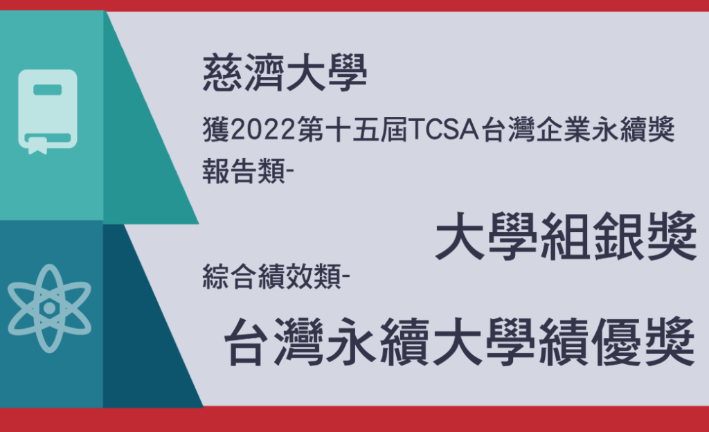 今年度再獲「永續報告」大學組銀獎及「永續綜合績效」台灣永續大學績優獎,除了肯定更是責任,慈濟大學透過更多教育推廣行動,鼓勵更多師生提高對永續發展趨勢的認知與認同,善盡高教公共性職責,共同為永續發展努力。