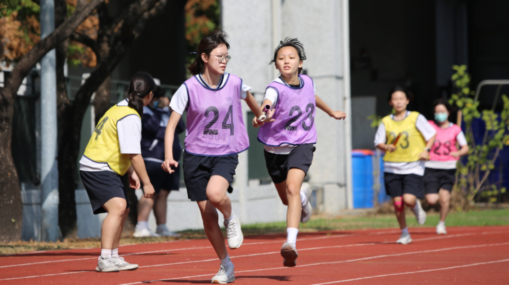 中學部除了進行一百公尺、兩百公尺個人賽以及四百公尺接力賽之外,更有眾所矚目的大隊接力,緊張刺激的微小差距,隨著振奮人心的鼓聲響起,嘶啞的「加油」聲浪沸騰,選手奮力衝刺終點線,瞬間將場邊所有師生的情緒帶向高峰,失敗的淚水與驕傲的汗水,交織成青春燦爛的詩篇,也讓這群學長學姊們盡吐平日埋首課業的壓力。